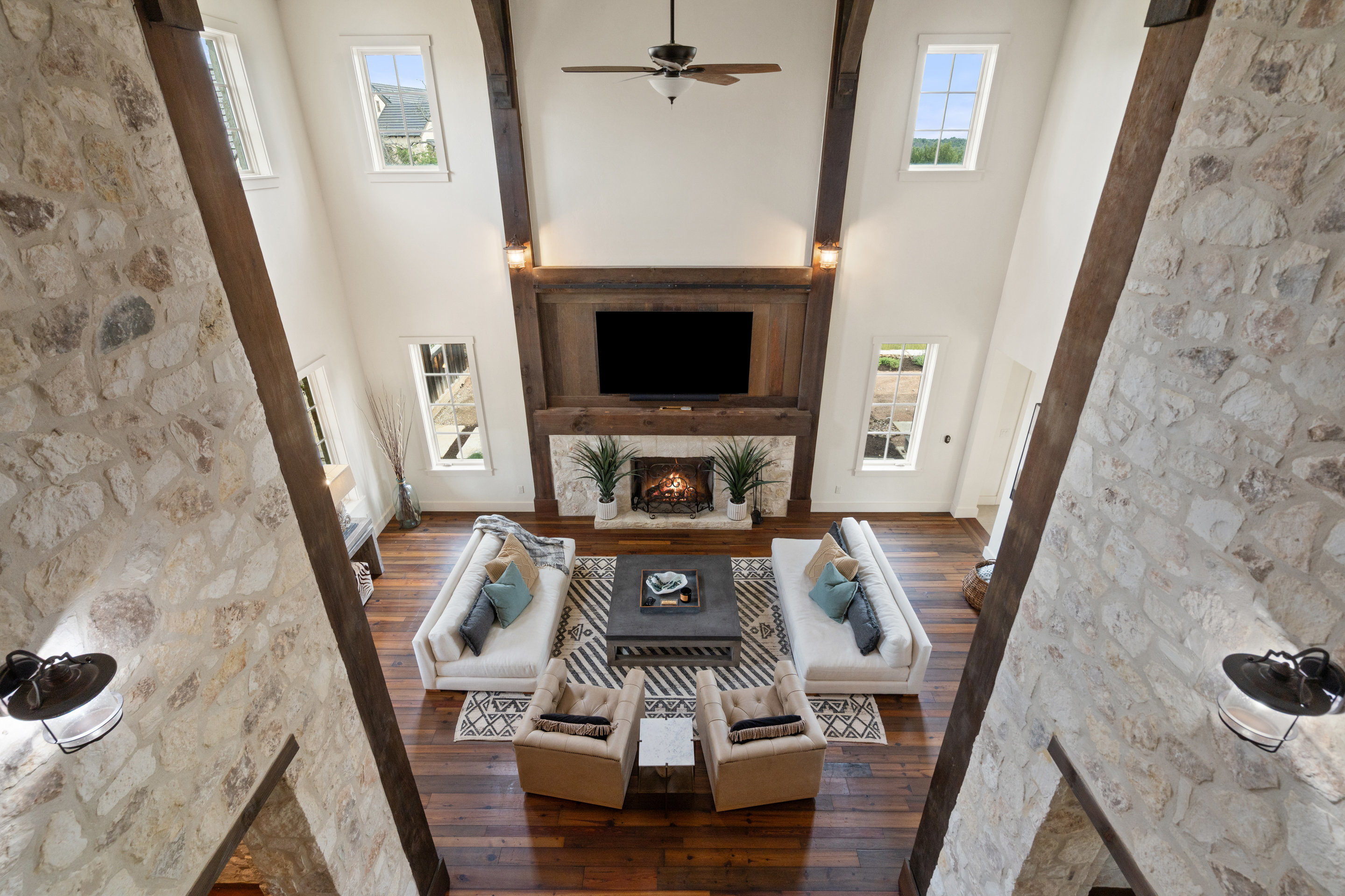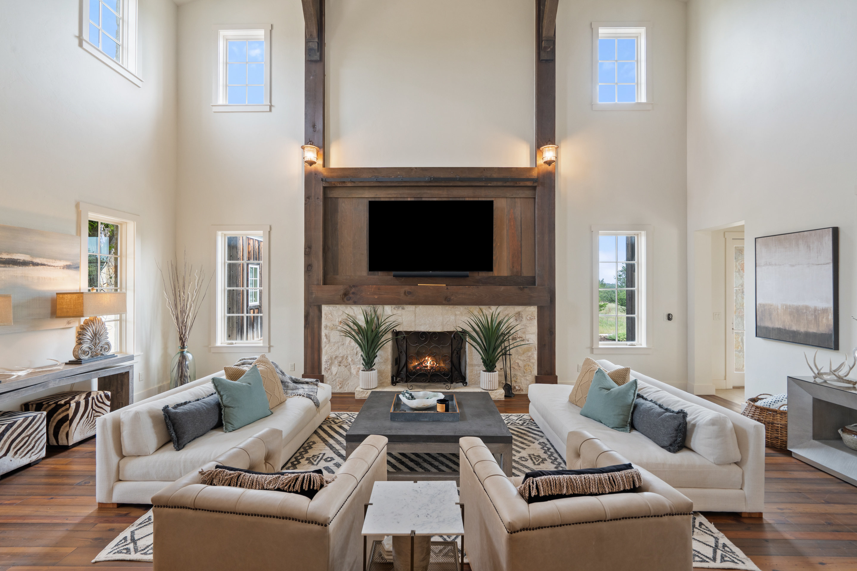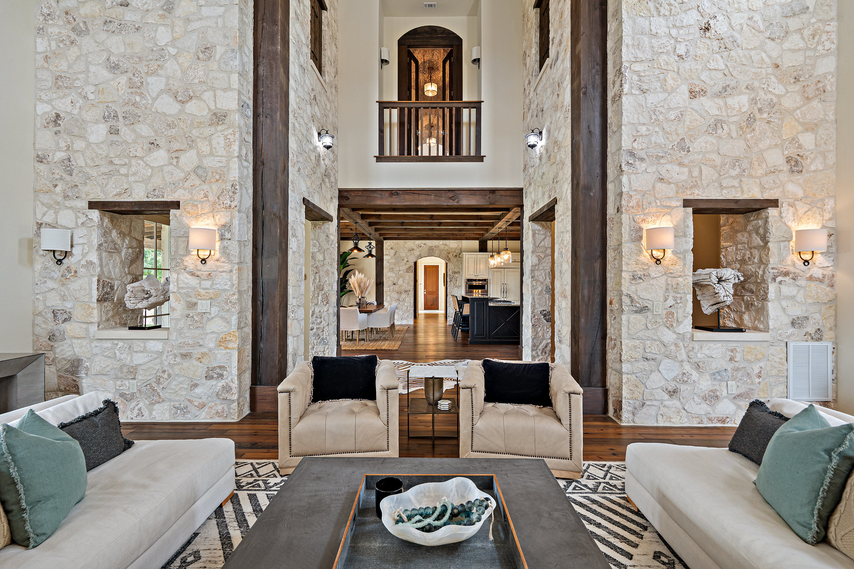 Inside, you'll find a beautifully crafted interior that brings the outdoors in, with rich wood beams, interior limestone walls, custom cabinetry, and hand-selected moldings throughout. The great room impresses with soaring ceilings, abundant natural light from large windows, and one of the home's five cozy wood-burning fireplaces.