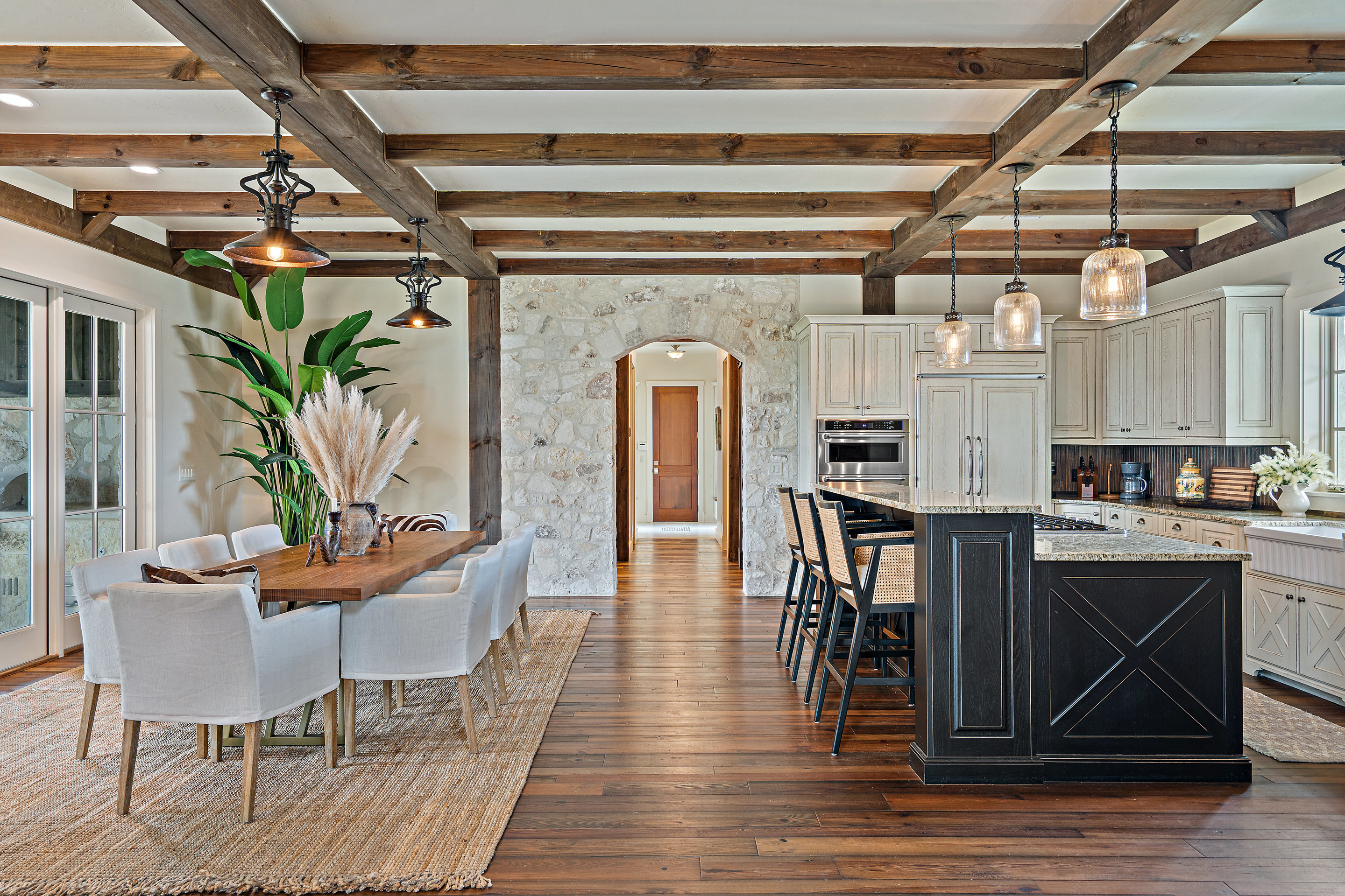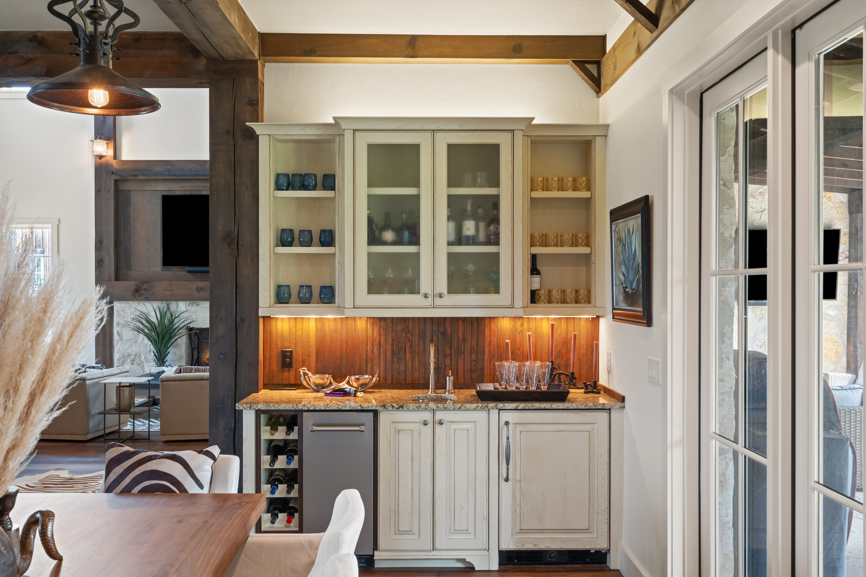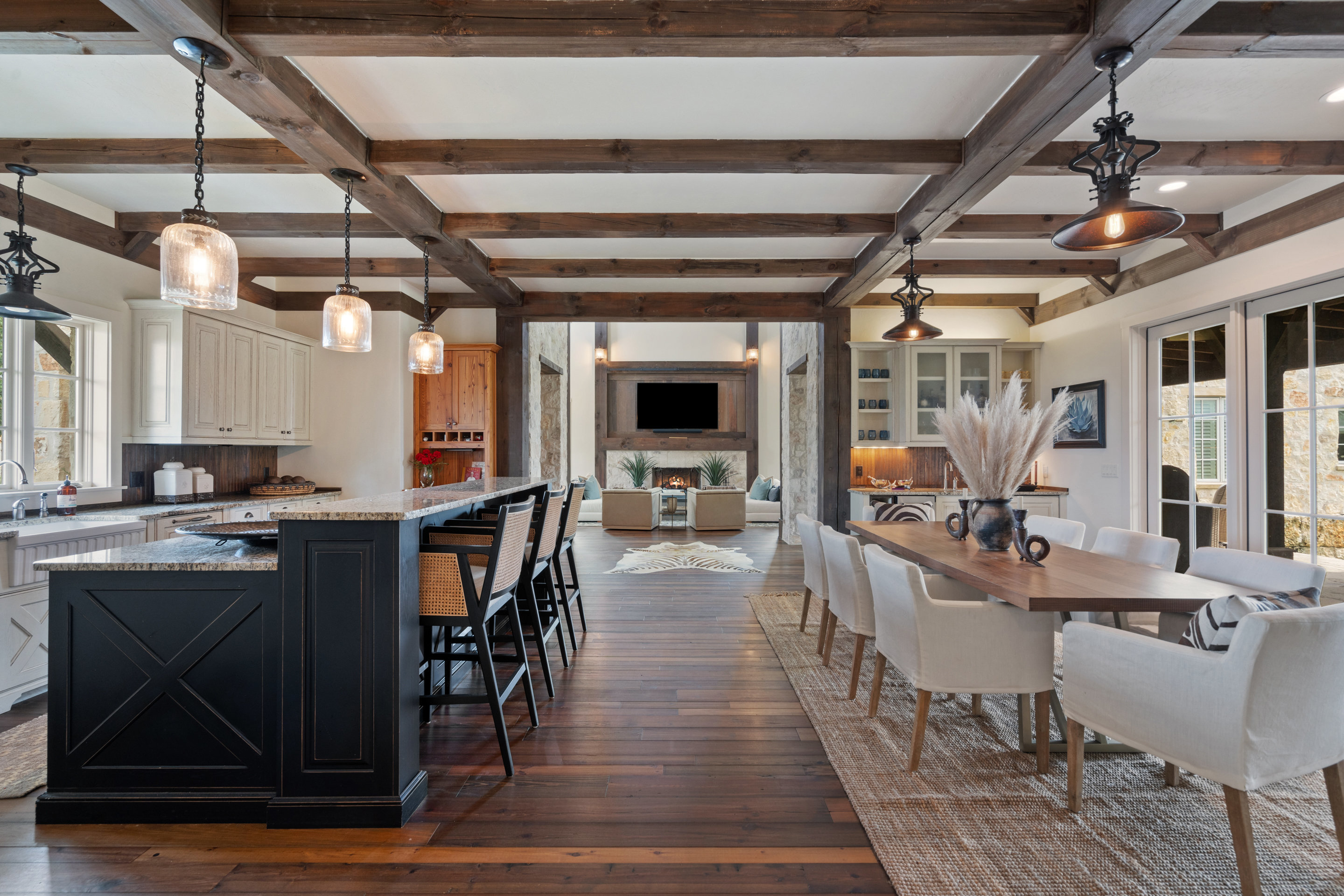 Inside, you'll find a beautifully crafted interior that brings the outdoors in, with rich wood beams, interior limestone walls, custom cabinetry, and hand-selected moldings throughout. The great room impresses with soaring ceilings, abundant natural light from large windows, and one of the home's five cozy wood-burning fireplaces.