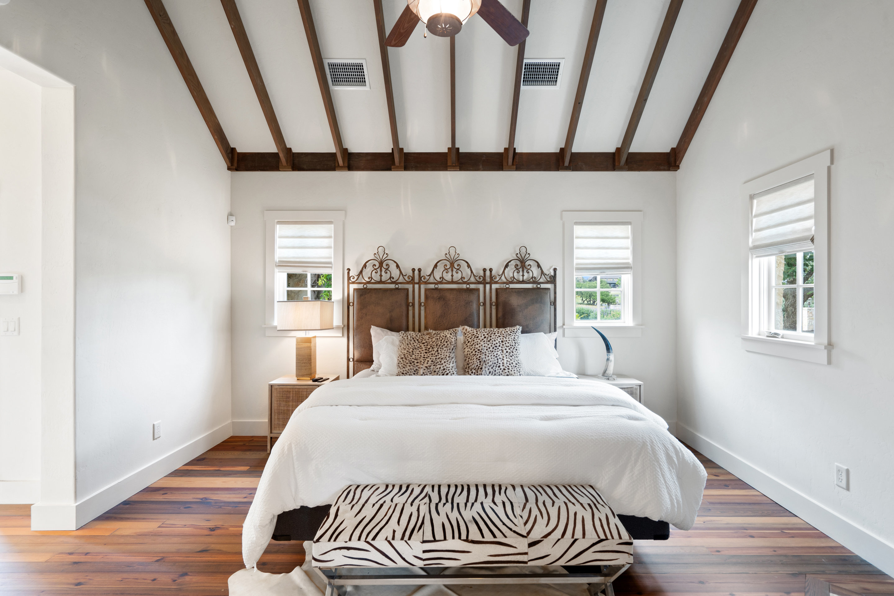 The property's two spacious indoor living areas offer plenty of room to relax or host, while plantation shutters and hardwood floors from a distillery add timeless charm and privacy.